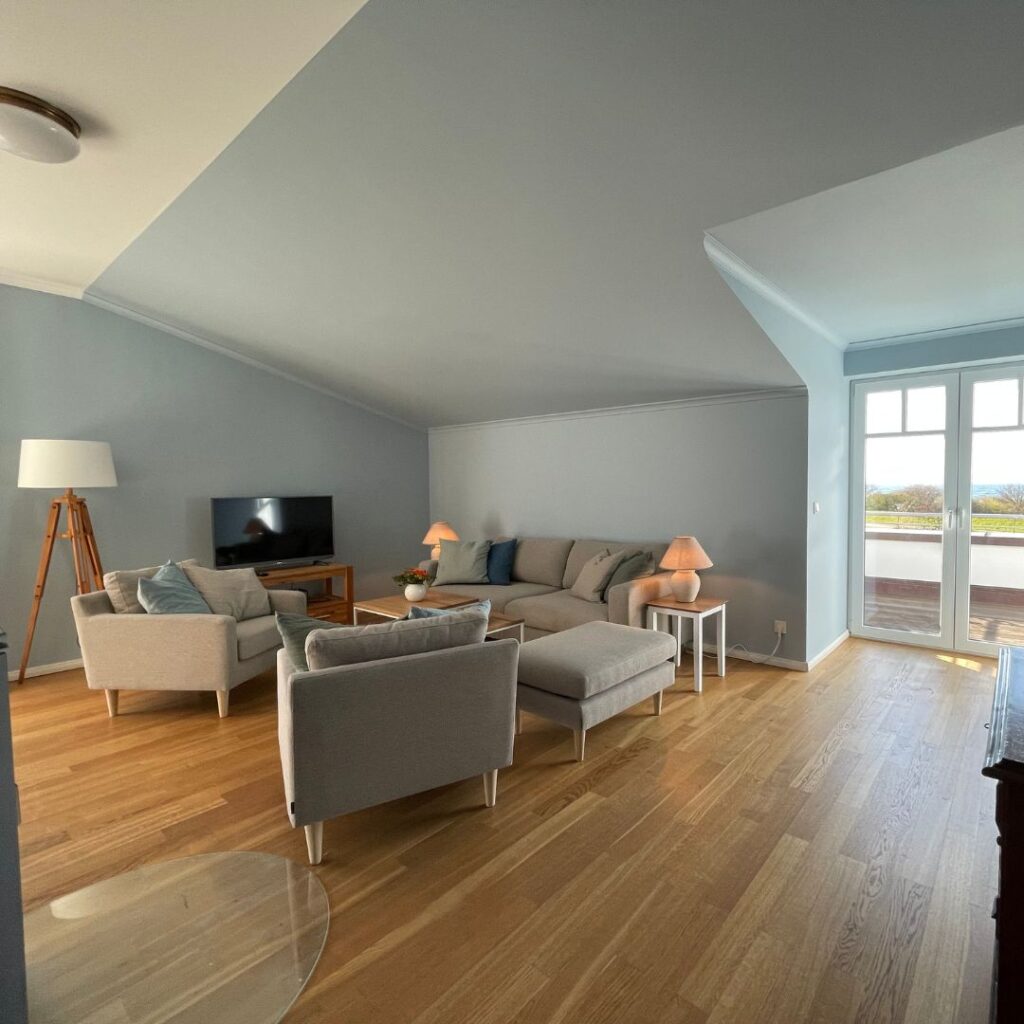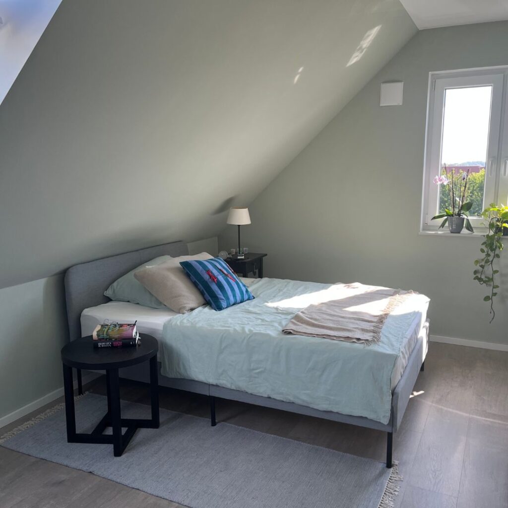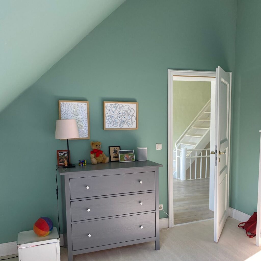 Viele Räume, besonders unter dem Dach, wirken unruhig, weil Schrägen und Decken weiß bleiben, während die Wände farbig gestaltet sind. Unsere Empfehlung: Wenn die Deckenfläche klein ist, streichen Sie Decke und Schrägen in der gleichen Farbe wie die Wand. Das erzeugt ein stimmigeres Gesamtbild.