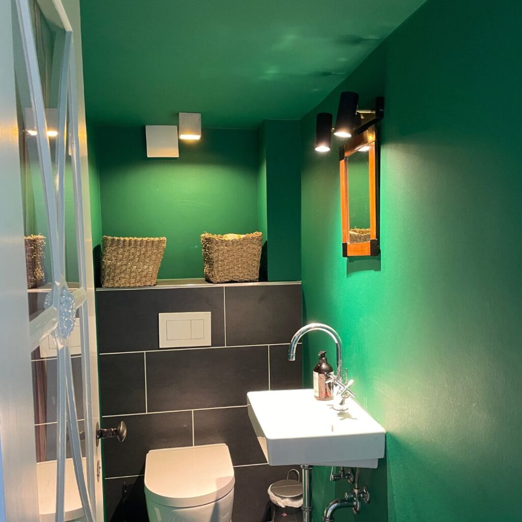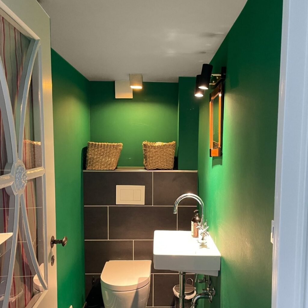 Tipp: Insbesondere in Räumen, in denen ein besonders kräftiger Farbton verwendet wird, sieht eine weiße Decke sehr störend aus. Man stelle sich nur einmal vor, die Decke in diesem kleinen, niedrigen Gäste-WC wäre weiß geblieben…